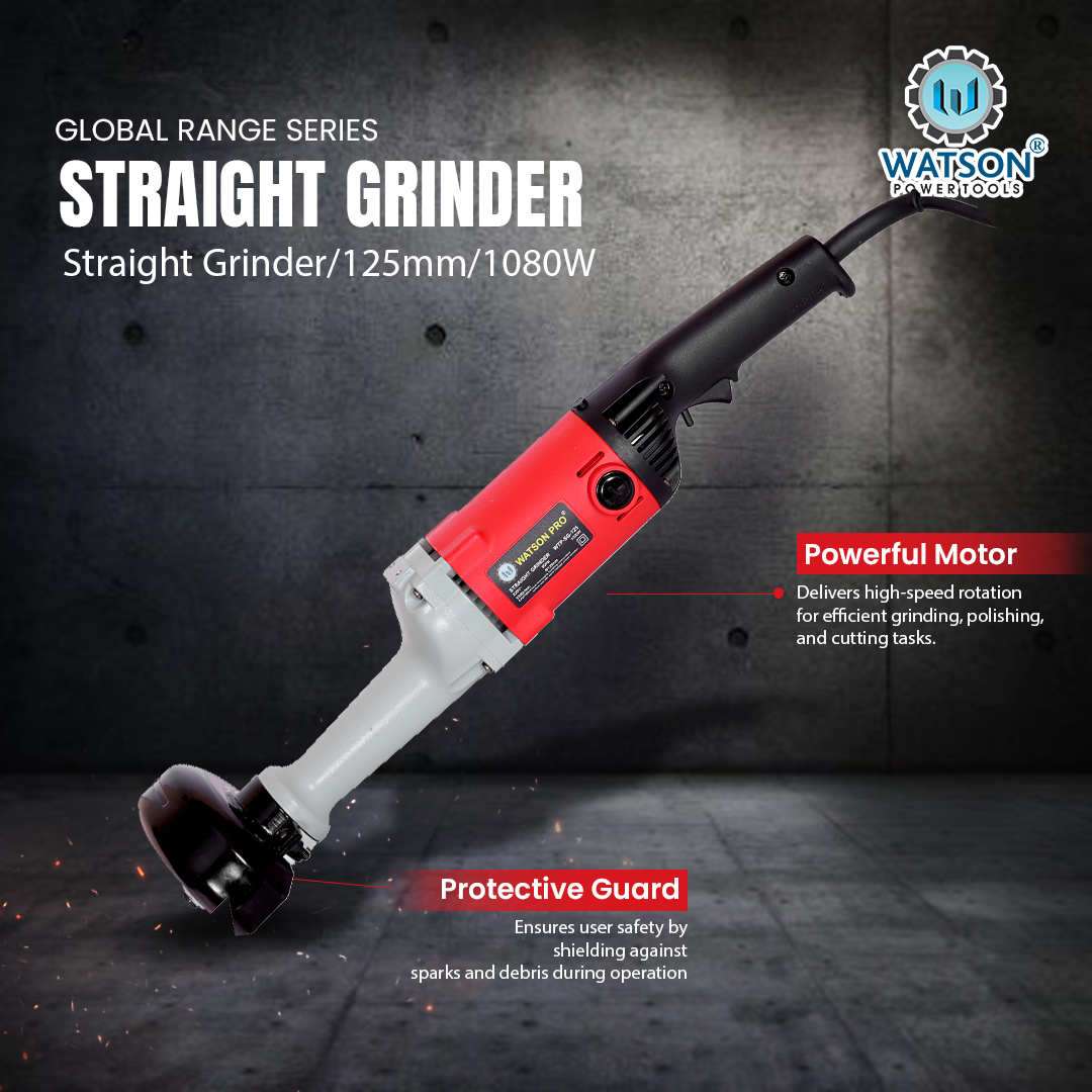 The Watson GQ-5 Straight Grinder Machine, Model 1143, offers versatility with its 1020-watt motor and 5300rpm No Load Speed, ideal for grinding tasks. It supports 125mm blades, features a spindle lock for quick blade changes, and ensures safety with a wheel guard. Designed for comfort, it includes a detachable handle and allows for easy carbon brush replacement.