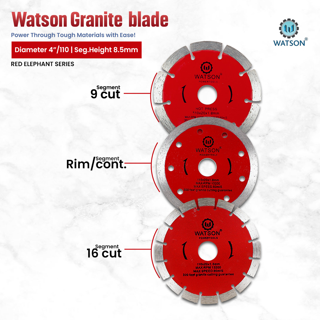 Watson Red Elephant Series features premium granite cutting blades with 16-cut rim and 9-cut segment designs. Built with hot-pressed segments, 8.5mm segment height, and 20mm bore size, these blades ensure fast, stable, and long-lasting performance for hard stone applications.