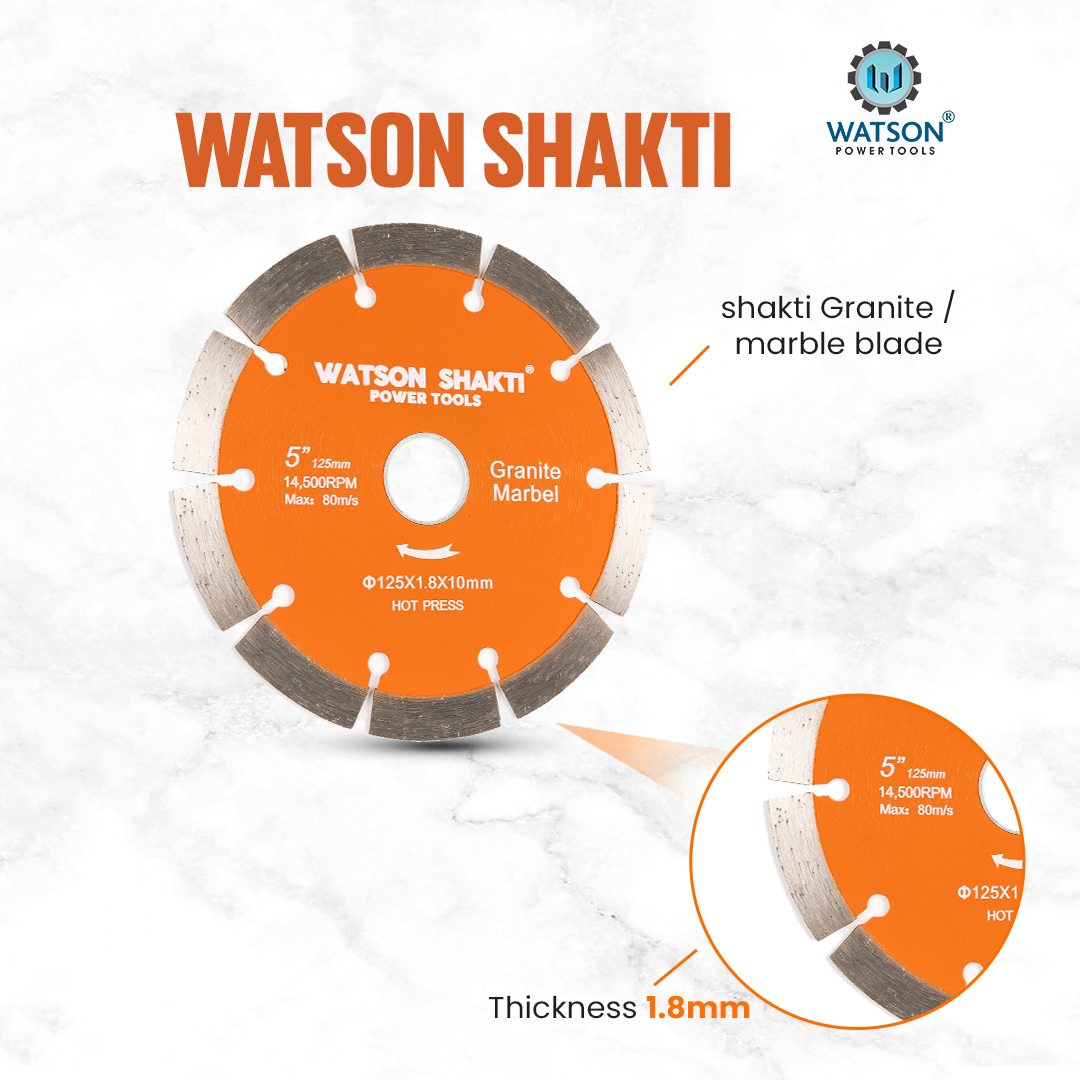Engineered for high-performance cutting, this 5-inch Watson Shakti blade features a 12mm segment height and 1.8mm thickness. Ideal for cutting hard granite and marble, it’s hot-pressed for durability and delivers clean, precise cuts at up to 14,500 RPM.