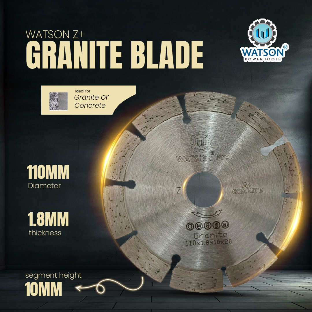 The Watson Pro Z Plus Segment Blade is engineered for high-performance cutting of granite and other hard natural stones. this blade delivers fast, precise, and chip-free cutting. Ideal for professionals, it ensures durability, reduced vibration, and long blade life.